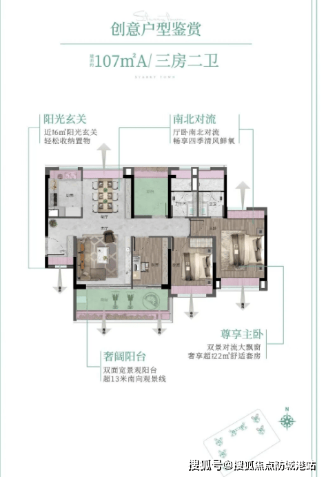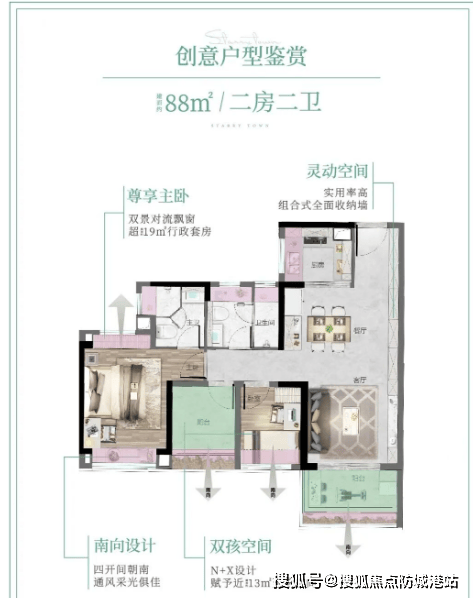 罕见四面宽小户型,三卧室朝南,超 11 米景观线,与阳光亲密接触。精细化收纳,约 10 米收纳墙,收纳空间大。