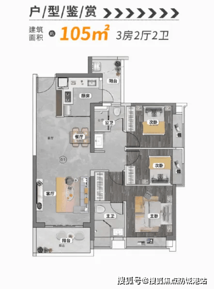 建面约105㎡三房两厅两卫,总价525万起,客厅连接阔景阳台,视野开阔,采光充足。休息区集中分布,更显安静私密,适合注重居住品质的改善家庭。阳台空间不仅可以用来晾晒衣物,还能改造成休闲小花园,打造属于自己的放松角落。