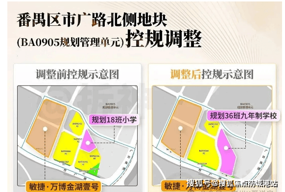 更值得关注的是,根据番禺区规自局公布的调规方案,市广路北侧地块已调整为 36 班九年制学校。按照广州教育配套标准,36 班九年制学校已属于片区主力学校规模,且参考番禺区教育政策,该学校很大概率将为项目业主提供直升优势,极大提升了教育资源的确定性。