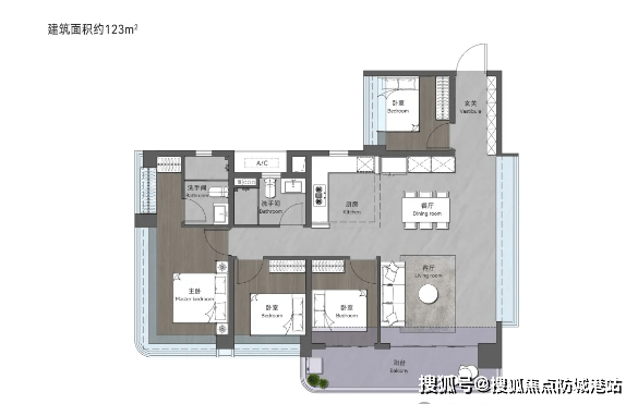 123㎡创意四房两卫:拥有约 15.9m 的奢阔采光面,南北通透大开间设计,让室内每一个空间都能享受充足的阳光与良好的通风。客厅连接景观阳台,能够俯瞰社区中央园林或金山湖美景,为业主带来极致的观景体验。户型布局方正,空间利用率高,没有浪费面积,是改善型家庭的优质选择。