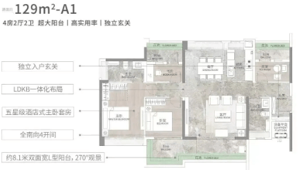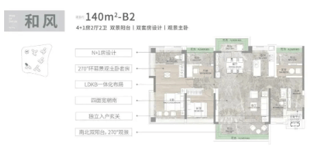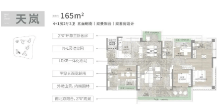 4栋靠山,两梯三户,提供140平和165平两种户型。 这些户型具有高得房率(90%~100%),3.1米的层高,并且房间次卧均采用全景落地窗设计,确保了室内充足的自然光线和开阔的视野。