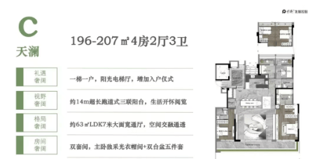197㎡四房三卫:超大面积,适合大家庭居住,部分户型配备观景露台,尽享湖景风光。