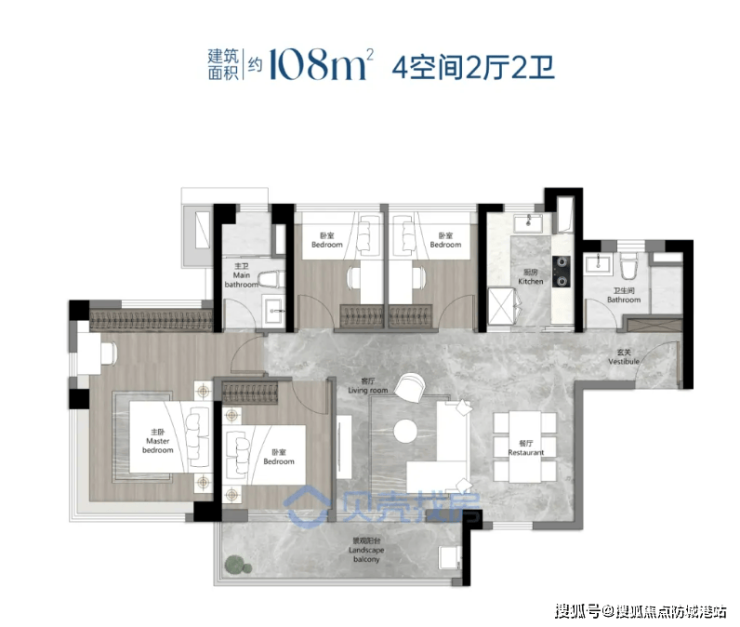 建面约108㎡四房两厅两卫(熙澄):南北通透,四开间朝南,灵动宽厅设计,独立入户玄关,步入式套房,适配改善四口之家。