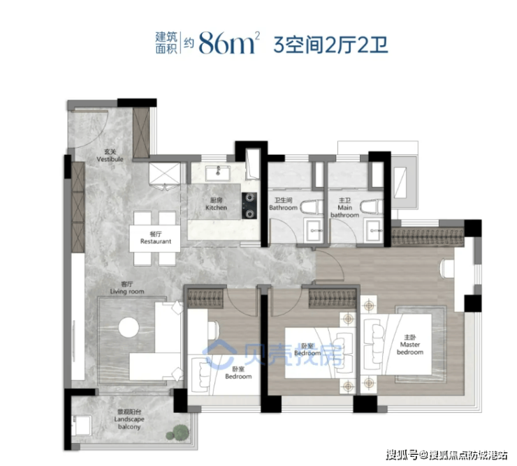 建面约86㎡三房两厅两卫(熙涵):全南向三房设计,三开间朝南,采光通风俱佳,客厅连接景观阳台,视野开阔,适配刚需三口之家。