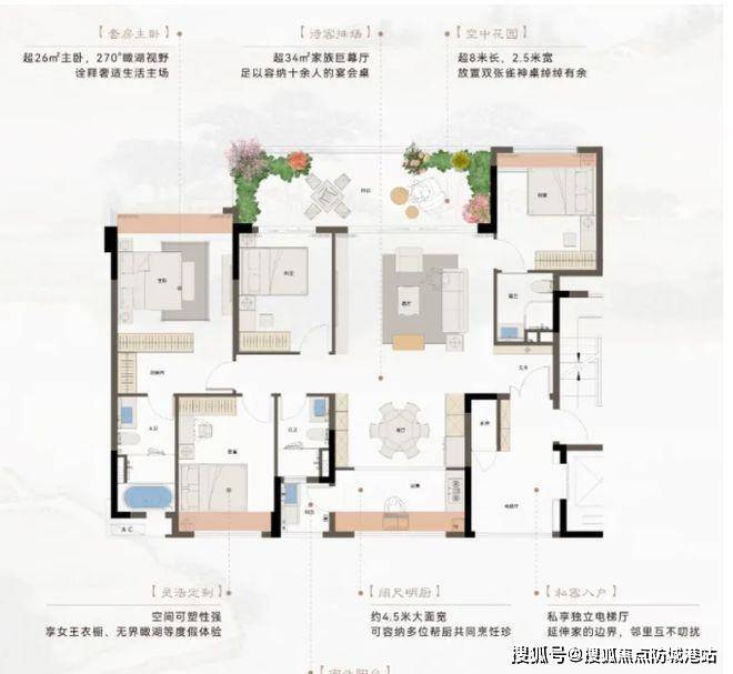 阳台与客厅亮点:南向 2.5 米 × 超 8 米宽瞰湖景阳台,为业主开启超广角视界,将博爱湖的秀丽湖景尽收眼底,仿佛一幅天然画卷在眼前徐徐展开。超 34㎡LDKB 巨幕家族厅,将客厅、餐厅、厨房、阳台一体化设计,空间开阔,居家待客自成排场。4.5 米大面宽阳台让厨房空间更加宽敞,多人下厨也不会觉得拥挤,烹饪过程更加轻松愉悦。
