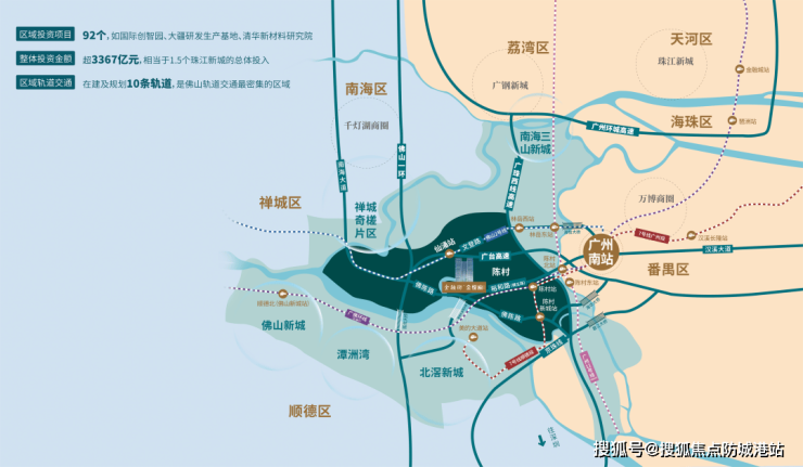项目位于陈村三龙湾核心区域,享受佛山市和广州番禺双城辐射带来的发展红利。作为三龙湾临广第一站,区域规划总投资超3500亿元,目标打造万亿级产业发展平台。三龙湾连接广州番禺、荔湾、海珠等重要区域,轨道交通密集,拥有多条地铁线路,包括佛山地铁2号线、广州地铁7号线西延段、广佛环线及规划中的佛山地铁11号线,构成多维度立体交通网络。驾车方面项目紧邻广珠西线高速和广州环城高速,快速通达广佛重要商务区,交通便利使得项目成为广佛一小时生活圈的重要节点。