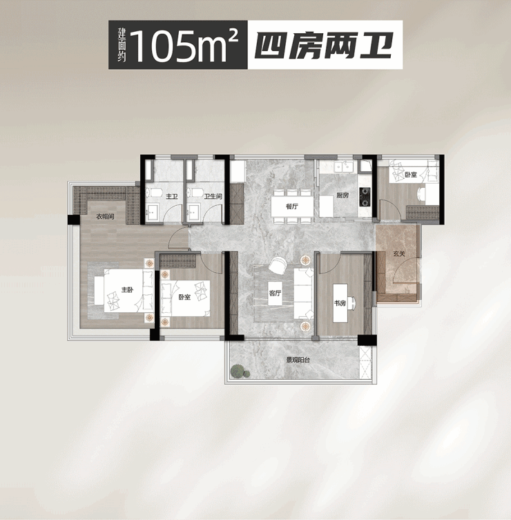 143㎡五房:主卧面积超30㎡,配独立衣帽间+双台盆浴室,堪比豪宅。