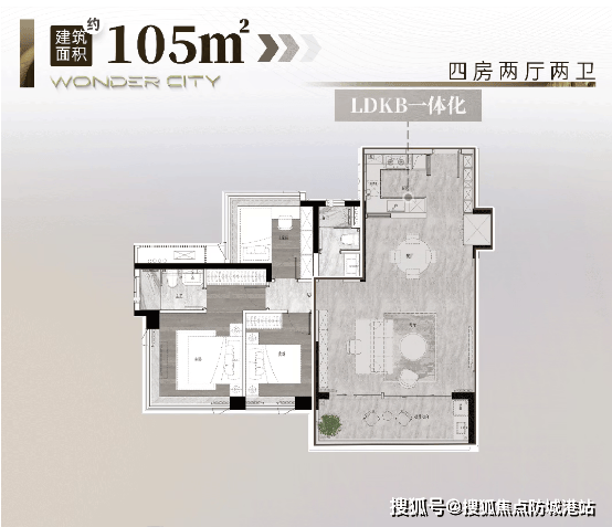 二期 105㎡四房:四开间朝南,LDKB 一体化设计,客厅开间最大 6.1 米,餐客厅面积超 30 平,媲美 150㎡户型;主卧带 270° 全景飘窗,可俯瞰 CBD 墅景,全屋飘窗拓展空间丰富,实用性拉满。