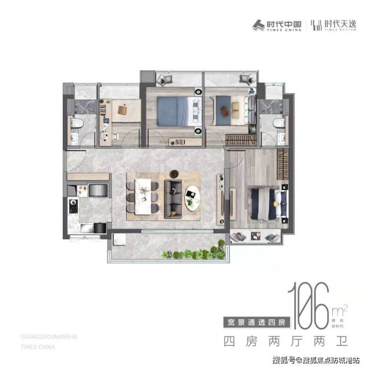 【时代天逸(广州)】位于广州南沙黄阁地铁站A出口,占地面积约11万㎡,首期建筑面积约38.72万㎡,其中商业建面约12.6万㎡。项目总户数首期约为2400户,提供建面约80-106㎡的三至四房户型。