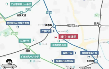 珠江·海珠里地理位置优越,位于海珠西的核心区域,紧邻燕子岗体育场,周边景观视野开阔,采光充足,通风良好。部分户型甚至可以欣赏到广州塔及广州圆等城市美景。项目周围环绕着多条地铁线,包括已运营的2号线、8号线和广佛线,以及在建的10号线和11号线环线。距离最近的地铁2号线江泰路站步行距离约为1.1至1.3公里,出行非常便捷。此外,项目附近交通路网发达,驱车前往琶洲、珠江新城、金融城等地都十分方便。