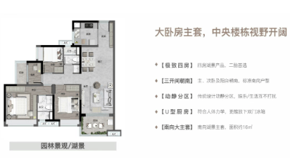 建面约140㎡ 四居室:四房双主套设计,配备6米大阳台,尽享极致湖景。