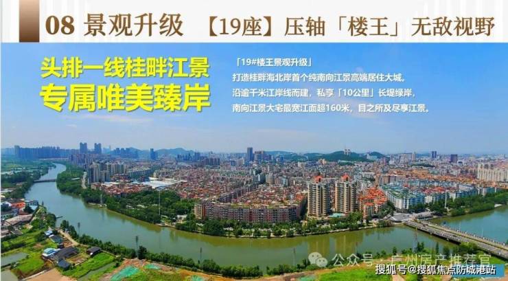 19座楼王景观升级,打造桂畔海北岸首个纯南向江景高端居住大城,沿逾千米江岸线而建,私享「10公里」长堤绿岸