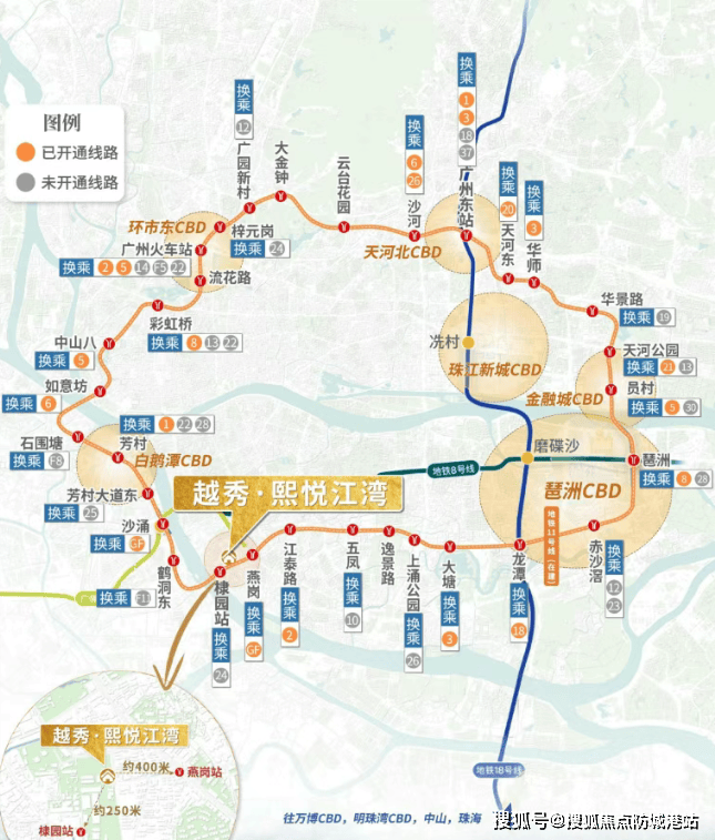 1、 **核心地段与交通枢纽优势**:越秀熙悦江湾所处位置使其在交通出行上具备无可比拟的优势。项目距离广佛线燕岗站B口约400米,与广州地铁11号线棣园站仅约250米之遥。凭借这两大地铁线路,7站可达广州南站,7站亦可抵达琶洲,实现了与城市重要交通枢纽及核心商务区的快速连接,极大地缩短了城市各区域间的时空距离。这不仅方便居民日常通勤,对于商务出行或外出旅游也提供了极大便利,轻松虹吸广佛优质资源。此外,周边1公里内分布着38个公交站,纸厂总站①距离小区仅78米,南石头便民1线、469路、544路等公交线路,构建起密集的公共交通网络。而从自驾角度,小区临近主干道,向北可接昌岗中路、内环路,向南能快速接驳新滘西路、环城高速,无论是前往珠江新城的繁华商圈,还是琶洲的商务中心,皆可轻松畅达,完善的交通路网为居民提供了多样化、高效便捷的出行选择,使其在城市生活中占据交通枢纽的核心位置。