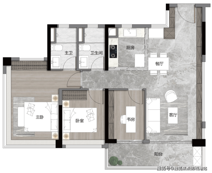 约85㎡ 三房两卫:超6米景观阳台,LDKB一体化设计,空间利用率高。