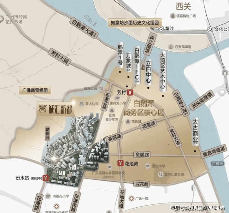 现状交通:项目周边构建4横5纵立体路网,15分钟车程直达海珠、越秀核心区;现有地铁1号线花地湾站(步行1.8公里,约25分钟),广佛线鹤洞站(车程10分钟)。