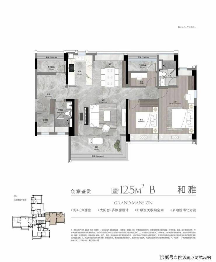 建面约125㎡三房两厅两卫:作为入门级改善产品,户型方正,动线流畅。拥有约6米开间的横厅,连接大尺度阳台,空间感开阔。主卧套房配置完善,是精英家庭入驻天河北核心圈层的品质之选。