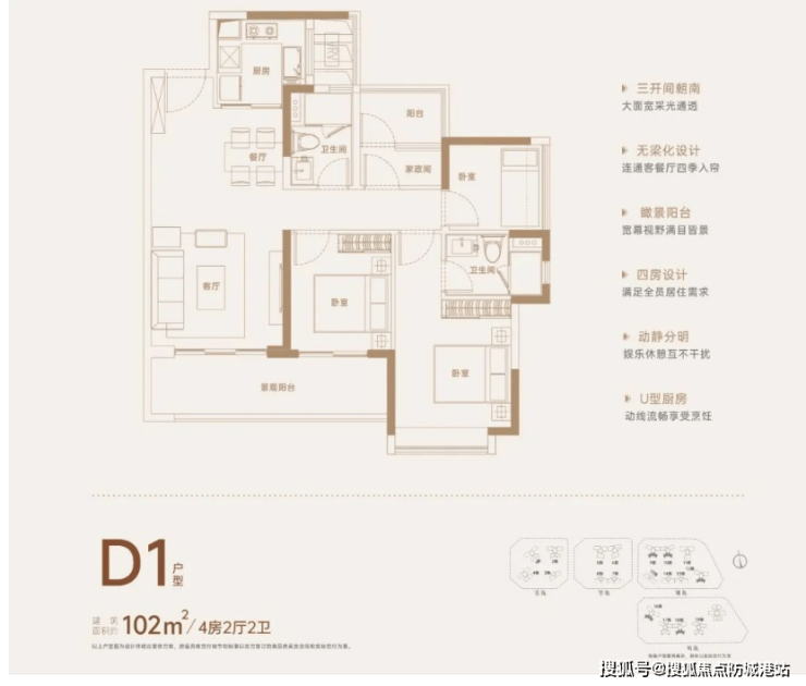 户型一:建面约102㎡四房两厅两卫:入门级改善户型,户型方正通透,客餐厅一体化设计,搭配观景阳台,空间布局合理,实用性与舒适度兼具,适配三口之家。