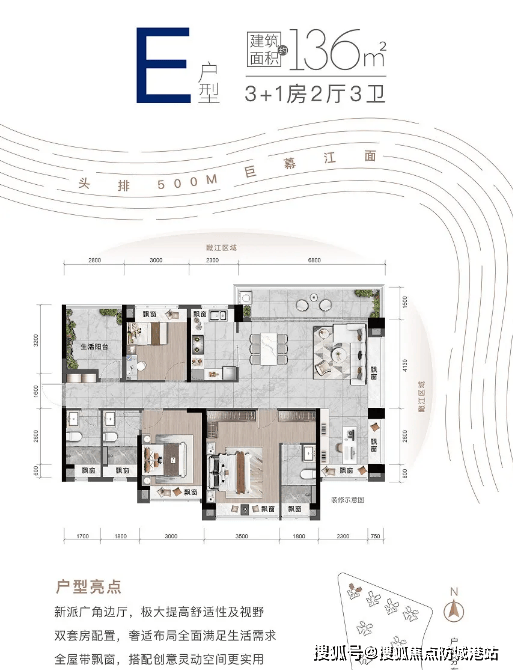 136㎡4房3卫,楼王核心户型,阔尺舒居设计,南北通透,采光通风俱佳,客厅宽敞大气,卧室空间充足,配备独立卫生间与衣帽间,私密性极佳,头排江景视野,无任何遮挡,每天都能享受江景与阳光,毛坯交付,可灵活规划空间,打造属于自己的滨江豪宅生活,适合高端改善家庭入手。