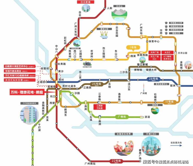地铁: 距离1号线地铁花地湾站仅400米,步行完全在可接受范围内。乘坐地铁1个站即可到达白鹅潭,12个站直达珠江新城,无需换乘。