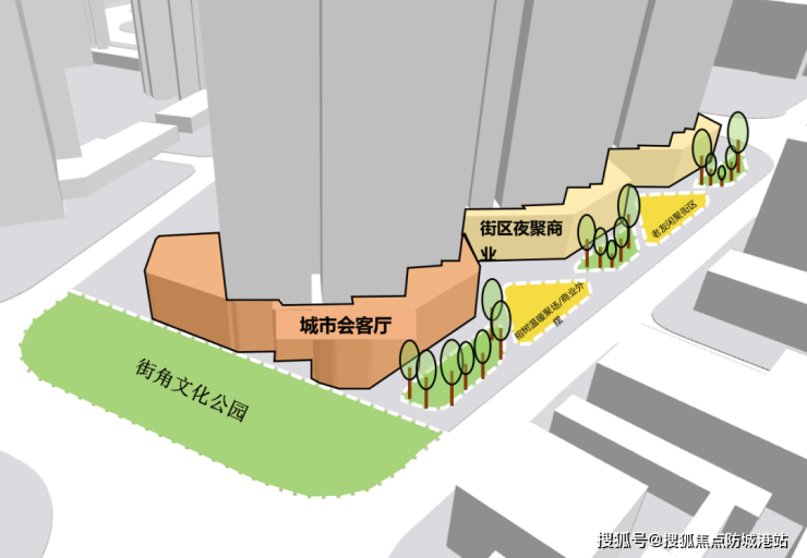 从流传出来的方案设计图,可以看到越秀采用了城市会客厅+街角文化公园+榕树要素,将打造老友闲聚街区、榕树温暖聚场等,确实很广府调调。