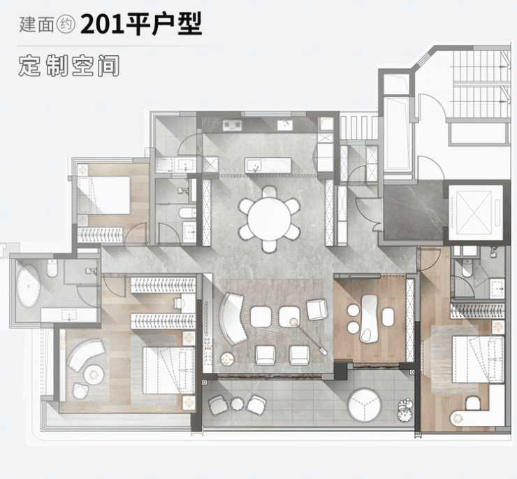 205㎡四房两厅三卫:位于 3 栋,2 梯 2 户设计,得房率约 83%。纯南向 5 开间朝南,270° 环幕江景视野,约 7.2 米阔景阳台,3.3 米奢阔层高。采用 “X+1” 定制空间设计,多功能空间可灵活改造为卧室、工作室、茶室、调香室等,适配多元家庭需求。双套房设计,动静分区合理,完美适配二孩家庭、三代同堂居住。
