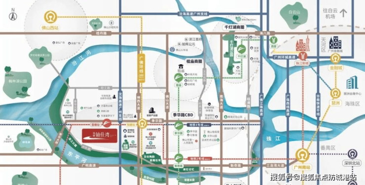 对于在广佛两地跑的朋友来说,时间就是金钱,交通就是生命线。旭辉恒基铂仕湾的位置,简直就是“长在地铁上”的典范。项目步行约10分钟(约500米)就能直达广佛地铁2号线智慧新城站。这可是实打实的地铁房,下楼买杯豆浆的功夫就到站了。坐上2号线,8站就能到广州南站,全程大概30分钟就能覆盖广佛核心区。这意味着什么?意味着你早上在广州喝早茶,晚上回佛山吃晚饭完全不是梦,彻底打破了广佛两地的地理界限。