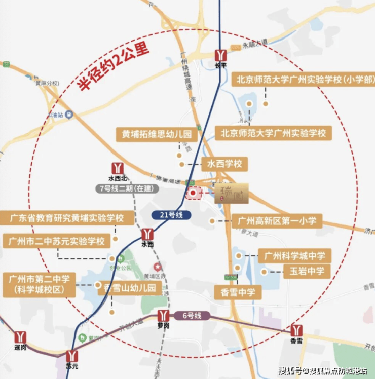 地铁:约 800 米直达21 号线水西站(快线,3 站到天河员村,换乘 5 号线直达珠江新城)、约 1 公里直达7 号线燕山站(在建,2026 年通车),双地铁加持,30 分钟直达天河核心区,15 分钟直达黄埔港。