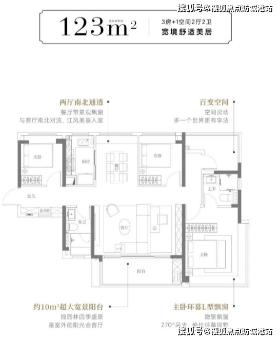 建面约103平的3+1房在整个片区来说相对稀缺。该户型采用横厅设计,同时自带约6米宽阳台,空间尺度可以和120平以上的大户型一较高下。