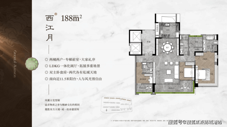 建面约160-200㎡四房及以上:此面积段产品堪称“世家尺度”,空间恢弘,功能齐全。采用独立玄关、宽厅、中西双厨、工人套房等奢配。客厅开间宏大,部分户型拥有转角全景阳台或空中院落,将园林景致最大化引入室内。双套房乃至多套房设计,完美适配多代同居的大家庭生活。