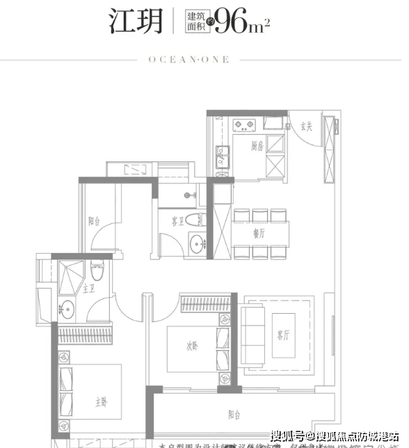建面约96㎡三房:竖厅布局,6.4米景观阳台贯通客厅与次卧,三开间朝南,阳光全天候洒满室内;