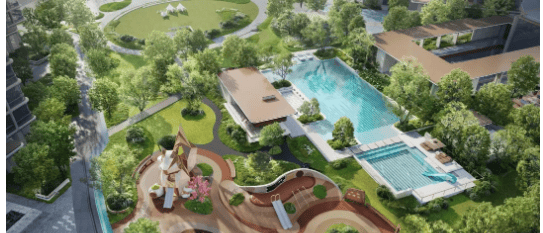 园林景观是项目的核心亮点之一,规划建面约13000㎡中央大花园,以“一轴·两环·五核心·多花园”为设计逻辑,复刻酒店微度假的高定园林生活灵感,搭配最宽约150米南北楼间距,让每一户都能享受充足的采光与开阔的观景视野。园林内打造草坪空间、儿童活动区、水景景观等多元场景,搭配凤凰木等绿植,实现建筑与自然的深度融合,让业主仿佛置身于天然氧吧。