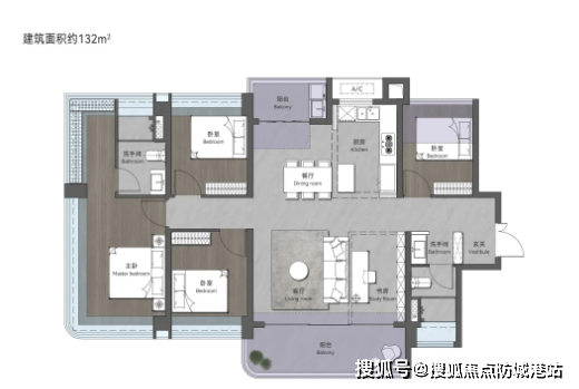 132㎡创意四房两卫:西南向布局,拥有超50㎡大方厅,格局大气阔绰且通透,客厅与餐厅无缝衔接,搭配宽景阳台,延伸空间尺度,打造极具质感的公共区域。户型细节设计精良,玄关处预留收纳空间,保护业主隐私,同时支持灵活改造;卧室空间充足,采光通风俱佳,四房设计可满足改善型家庭的居住需求,彰显从容生活格调。