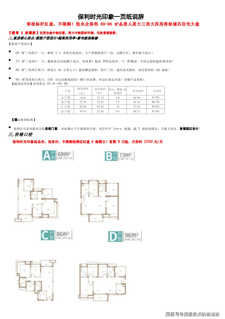 产品价值:69-96㎡全能户型,高得房率,全南向/南北对流,精装交付,智能化家居,满足多样化居住需求。