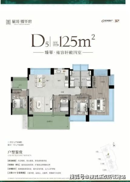 125㎡四房两厅两卫:改善优选,横厅布局,主卧套房设计,全屋智能家电接口预留。