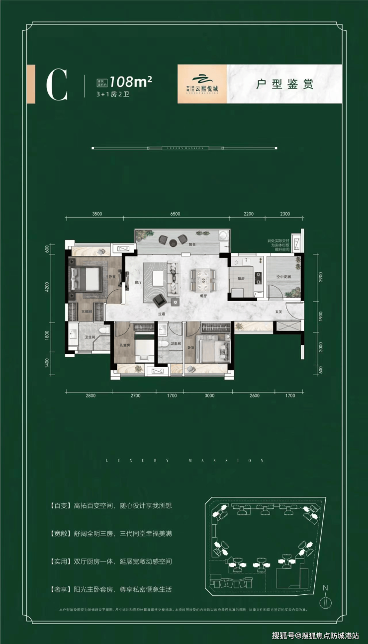 建面约108㎡(四房两厅两卫):改善型户型,南北通透,横厅设计,宽绰阳台,双面景观,实用率高;南北面宽14.5米,360°超大采光及景观面,动静分区明确,空间布局合理,二孩家庭居住无压力,满足改善型居住需求。