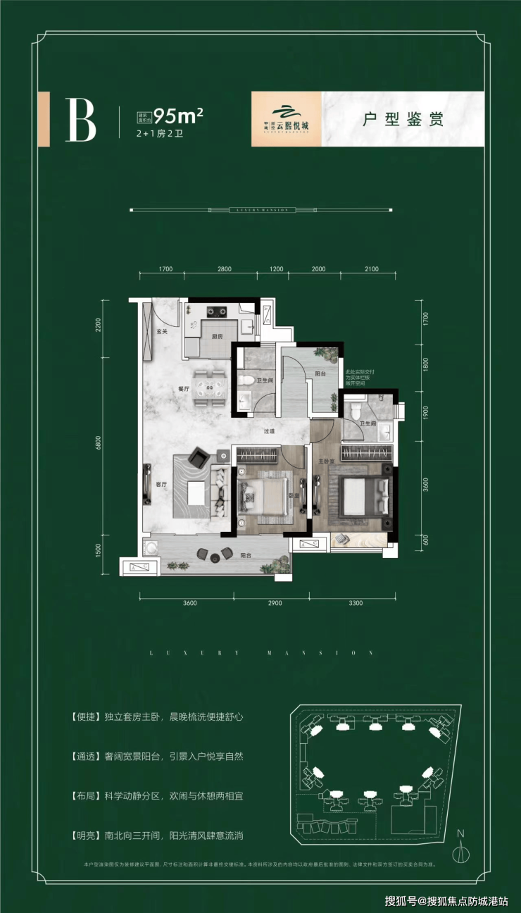 建面约95/97㎡(三房两卫):主力刚需户型,南北通透,竖厅设计,宽绰阳台,实用率高;最小面积三房带主套,正对中心园林,超大阳台,视野开阔,采光通风俱佳,适合三代同堂或有二胎计划的刚需家庭居住,兼顾实用性与舒适性。