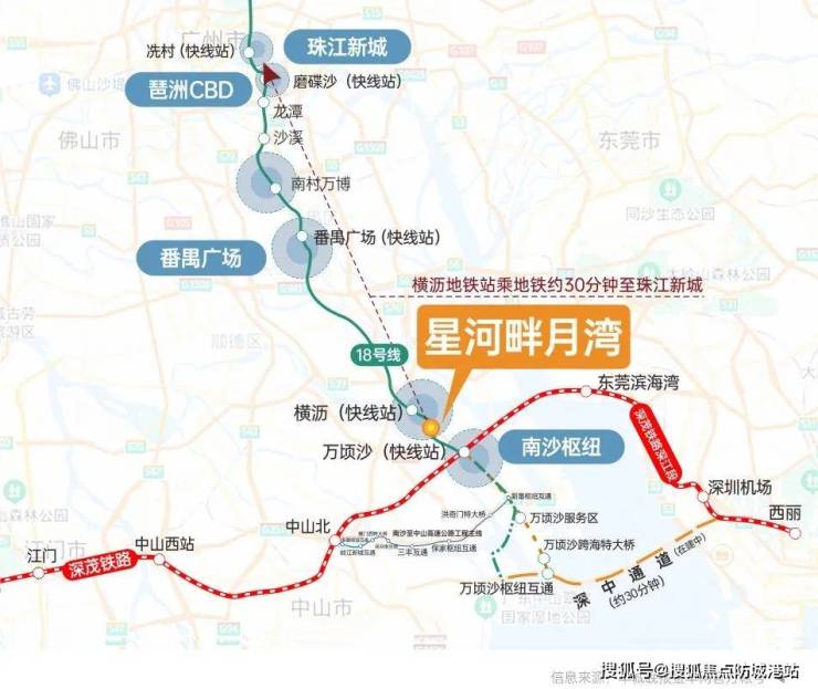 星河·畔月湾的交通优势得天独厚,首批交楼后将开通免费业主楼巴接驳地铁18号线横沥站,地铁18号线贯穿南北,1站可达番禺广场,2站琶洲,3站直达珠江新城,快速连接广州核心区域。项目距离南沙枢纽站仅约5公里,未来深江高铁(在建中)将接入,实现2站到深圳机场的便捷出行。