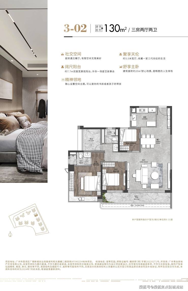 中海保利朗阅精准锚定广钢新城刚需与改善人居的核心需求,打造了建面约98-186㎡的全明三至四房产品,全系户型遵循“以人为本、空间极致”的设计理念,突破传统户型的空间局限,通过N+1灵动空间设计、飘窗全赠送、阳台半赠送的创新手法,实现了超85%的超高得房率,远超市场同类型产品,在同等面积下为业主带来了更阔绰、更实用的居住空间。项目户型规划兼顾了私密性与实用性,全系采用动静分区的经典布局,将客厅、餐厅、厨房等公共活动区与卧室、书房等私密休息区完美分隔,日常待客、家庭欢聚的热闹场景,与休息、学习的静谧空间互不干扰,充分保障居住的私密性。全系户型均采用全明通透格局,实现了多开间朝南、南北通透的设计,做到了明厨明卫、无暗房、无死角的空间规划,最大化提升室内的采光面与通风效果,让阳光与清风能够轻松铺满室内的每一个角落。主力户型均采用LDK客餐厨一体化设计,将客厅、餐厅、厨房三大核心空间打通,形成了超大的家庭公共活动区,既提升了空间的整体感与通透感,也让家庭成员之间的互动更加紧密,无论是家庭日常用餐,还是亲友聚会,都能拥有充足的空间。同时项目全系户型均采用双卫设计,彻底告别早高峰洗漱排队的尴尬,主卧均采用套房式设计,配备独立卫浴与全景飘窗,部分大户型更预留了独立衣帽间空间,充分保障主人的居住私密性与尊贵感。其中建面约98㎡的全能三房户型,打造了三开间朝南、双卫双阳台的格局,在有限的空间内实现了全功能布局,完美适配年轻家庭的首置需求;建面约128㎡的灵动四房户型,适配多代同堂或二胎家庭的居住需求,N+1灵动空间可随心打造为书房、儿童房、健身室,赋予生活更多可能性;建面约186㎡的奢阔四房户型,采用南北双向观景设计,搭配约7.2米的阔景阳台,直面广钢中央公园盛景,匹配高端改善人群的居住需求,以科学的空间设计,赋能全家庭的理想人居生活。