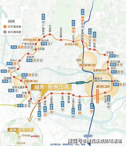 越秀熙悦江湾位于广州市海珠区,紧邻广佛线燕岗站B口约400米,距离广州地铁11号线棣园站仅250米。这一优越的地理位置使得居民可以轻松抵达琶洲、珠江新城等重要商务区,享受都市生活的便利。此外,项目周边公共交通网络发达,步行几分钟即可到达多个公交站点,为居民提供了极大的出行灵活性。