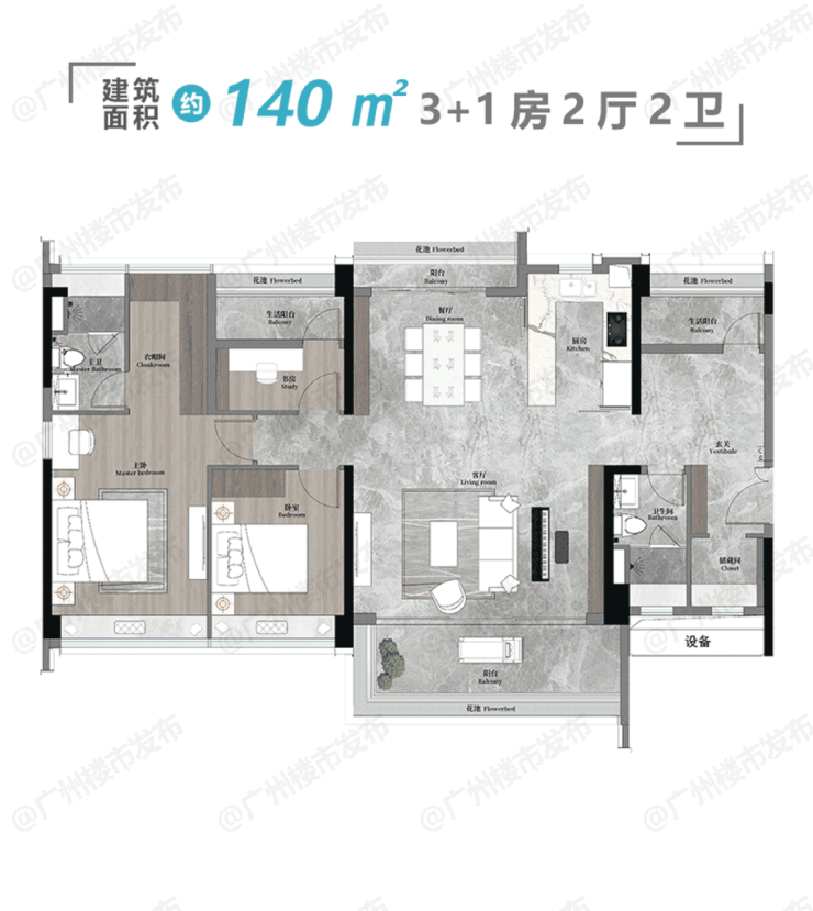 140平方米户型:LDKG一体化设计营造出约60平方米的敞阔公区,适合家庭欢聚或朋友宴请。主卧南北通透、三面采光,独立衣帽间与预留的枕边空间,极大提升了舒适度与私密性。