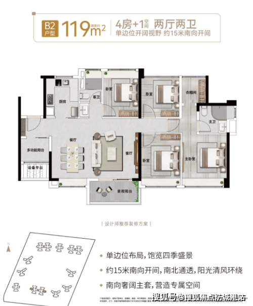 1. 面积与房间数量:建面约119㎡,规划为4房+1空间、2厅2卫,“+1空间”可灵活改造,满足业主多样化的改善需求,同等面积下实现多一房的实用功能,空间利用率极高。
