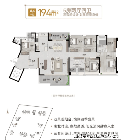 1. 面积与房间数量:建面约194㎡,规划为5房2厅4卫,其中3个套间设计,五个房间可满足大家庭的居住需求,同时4个卫生间设计,避免使用冲突,提升居住舒适度,是高端改善人群的首选户型。