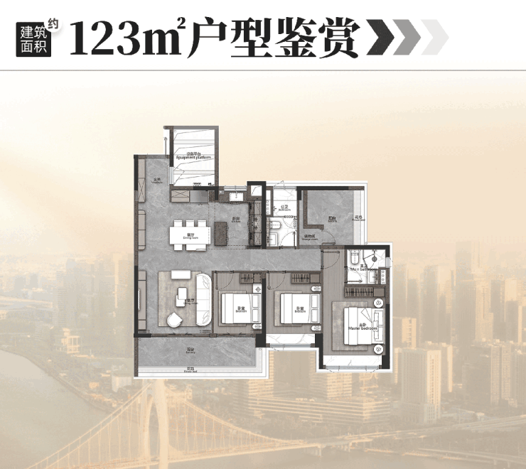 建面约123㎡四房两厅两卫:创新性地打造了4+1房,每个空间都有足够的舒适感。四开间朝南,双面宽景观阳台长约6.5米,室内采光通风畅意。
