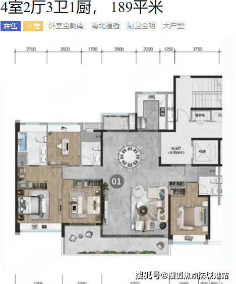 189平米大户型,卧室全朝南,南北通透,厨卫全明,空间更加宽敞,品质更高,能为业主提供更舒适、更私密的居住环境,适合有高端改善需求的家庭,无论是家人居住,还是接待客人,都很有面子。