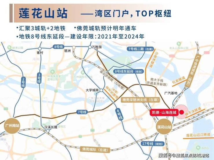 轨道:规划中的地铁8号线东延段莲花站(预计2027年通车)距项目较近,3站直达琶洲;佛莞城轨3站至长隆,4站至广州南站,构建“广佛莞半小时生活圈”。