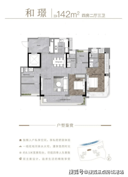 142㎡四房两卫:一线花地河景观户型,享受中轴王座的尊贵视野。