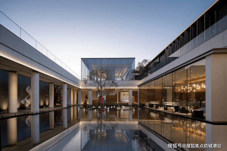 建筑设计呈现出简约透明的玻璃盒状外观,在周围镜面水池的映衬下,形成了令人惊叹的“水镜宝盒”视觉体验。这种纯洁优雅的姿态漂浮在街角水景之上,与周围的连续景观相得益彰,勾勒出一幅现代都市的独特画卷。