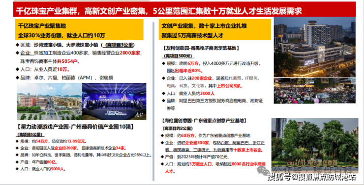 答:周边有西坊大院文创园、珠宝产业基地、海伦堡创意园等产业集群,3 公里内有奥园广场、钻汇广场等大型商业,配套成熟完善。