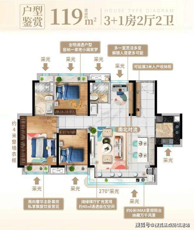 空间布局:南北通透设计,空气流通顺畅,室内时刻保持清新。四房的设计能够满足三代同堂或二孩家庭的居住需求,每个家庭成员都能拥有相对独立的生活空间,保障生活的私密性与舒适度。