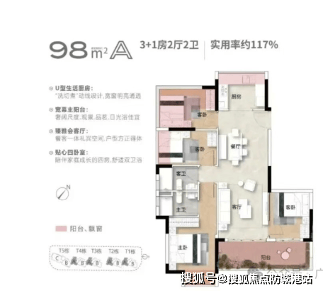 约98㎡户型:巧妙布局为3+1房2厅2卫,主卧带大飘窗,客卧直连主阳台,空间通透灵动,满足多孩家庭或三代同堂的进阶需求。
